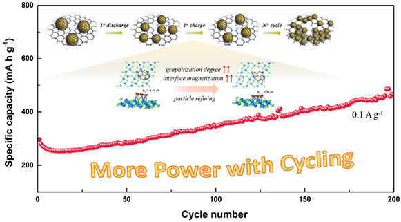 They found that the FeP nanoparticles went through a refining-recombination process during the first cycle and presented a global refining trend after dozens of cycles. This resulted in a gradual increase in graphitization degree and interface magnetization, and further provided more extra active sites for Na+ storage and contributed to a rising capacity with cycling. The capacity ascending phenomenon could also extend to lithium-ion batteries (LIBs). It can maintain a capacity retention of 90.3% for LIBs after 5,000 cycles at 10 A g-1.