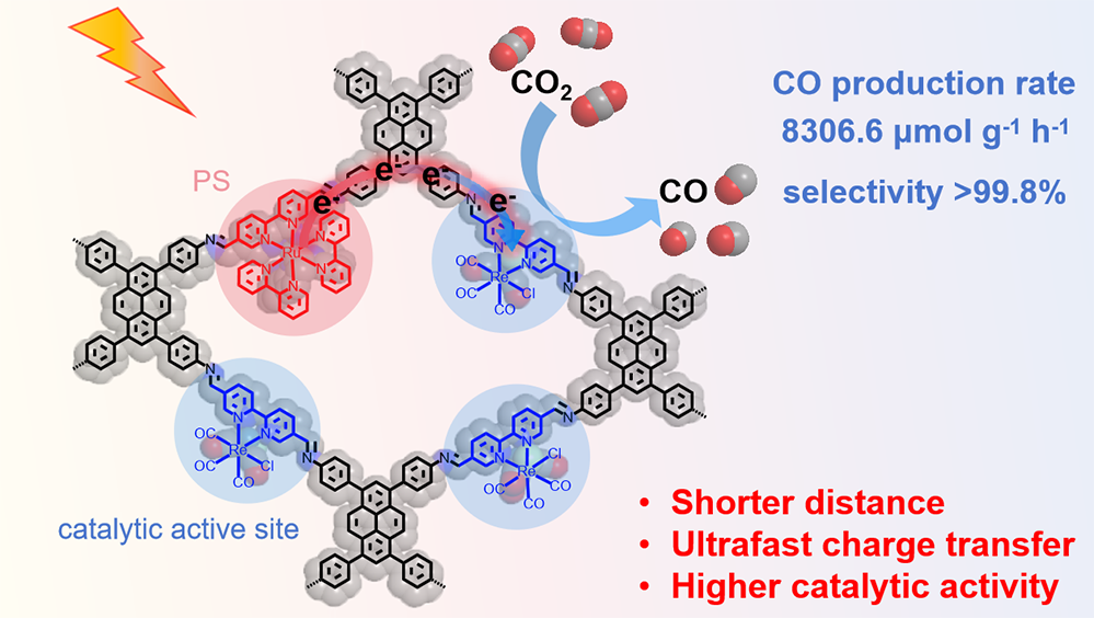 Researchers first constructed the COF photocatalyst, namely PBCOFRuRe, through in situ Schiff-base condensation of Pyrene with MBpy (M=Ru, Re) units. In this structure, Ru and Re are anchored within bipyridine as the photosensitive center and catalytic site, respectively. PBCOFRuRe was confirmed to have excellent crystallinity, porous nature and high CO2 adsorption capacity, and the Ru and Re coordination environment was elucidated, providing comprehensive structural characterization of PBCOFRuRe.