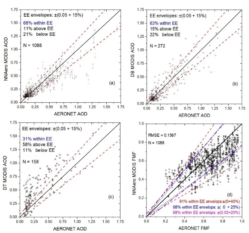 According to the study, the validation of the NNAero FMF versus AERONET data showed a significant improvement with respect to the DT FMF, with Root Mean Squared Prediction Errors (RMSE) of 0.1567 (NNAero) and 0.34 (DT). The NNAero method showed the potential of improved retrieval of the FMF.