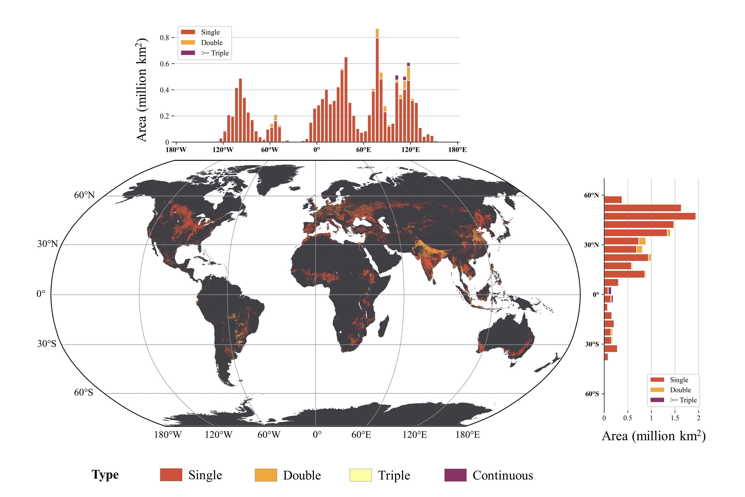 The dataset indicates that single cropping is the primary agricultural system on the Earth, accounting for 81.57% (12.28 million km2) of the world's cropland extent. Multiple-cropping systems, on the other hand, are commonly observed in South America and Asia. In addition, large variations are found across countries and agroecological zones, reflecting the joint control of natural and anthropogenic drivers on regulating cropping practices.
