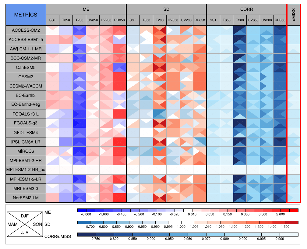 Performance of the CMIP6 models and bias-corrected data (MPI-ESM1-2-HR_bc) in simulating the climatological mean (1979-2014) of multiple variables against the ERA5 data. Lighter colors represent a better model performance. (Image by XU Zhongfeng)