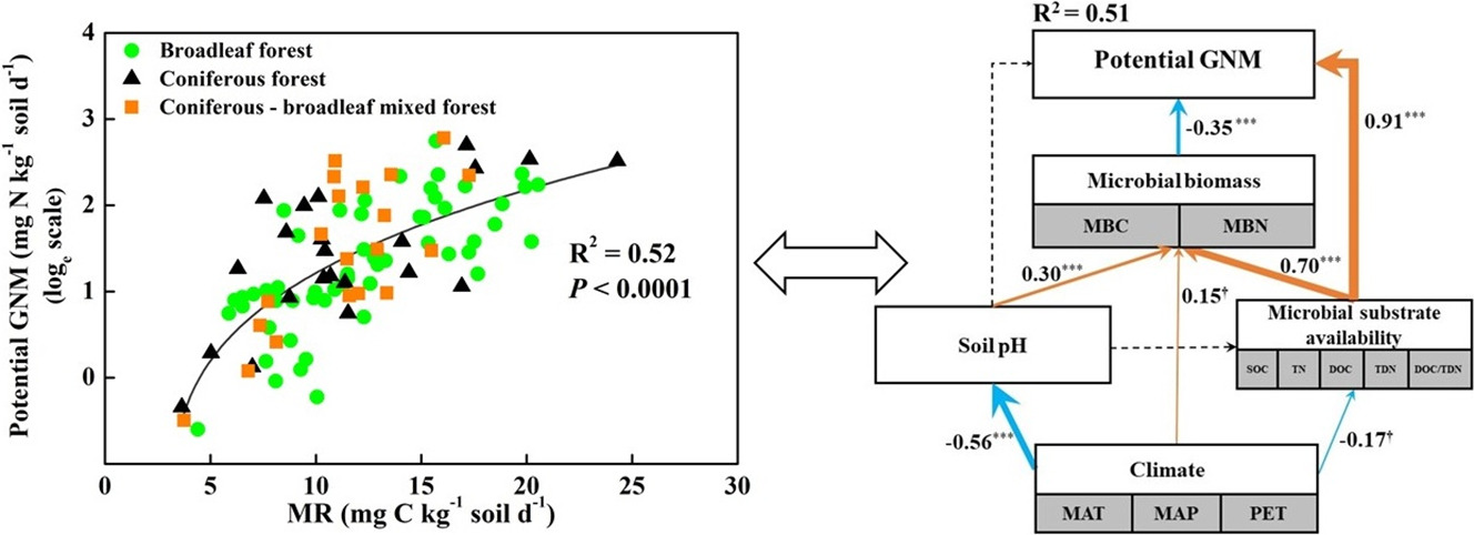 They found that potential gross nitrogen mineralization linearly decreased with potential evapotranspiration, and had a positively non-linear relationship with microbial respiration.