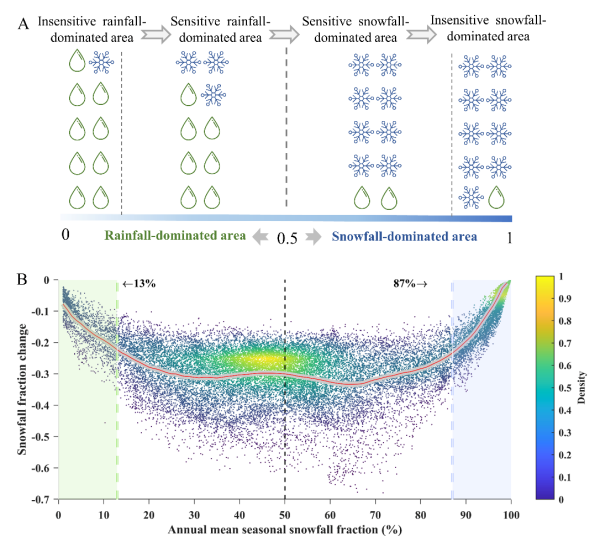 They found that snow-rain transition areas (0.13 <S/P<0.87) showed heightened sensitivity to global warming, with snowfall rates declining 3 to 5 times faster than those in snow-dominant areas (S/P > 0.87) or rain-dominant areas (S/P < 0.13). This nonlinear response challenges assumptions of uniform snowfall reductions under warming conditions and highlights the disproportionate vulnerability of transitional zones.