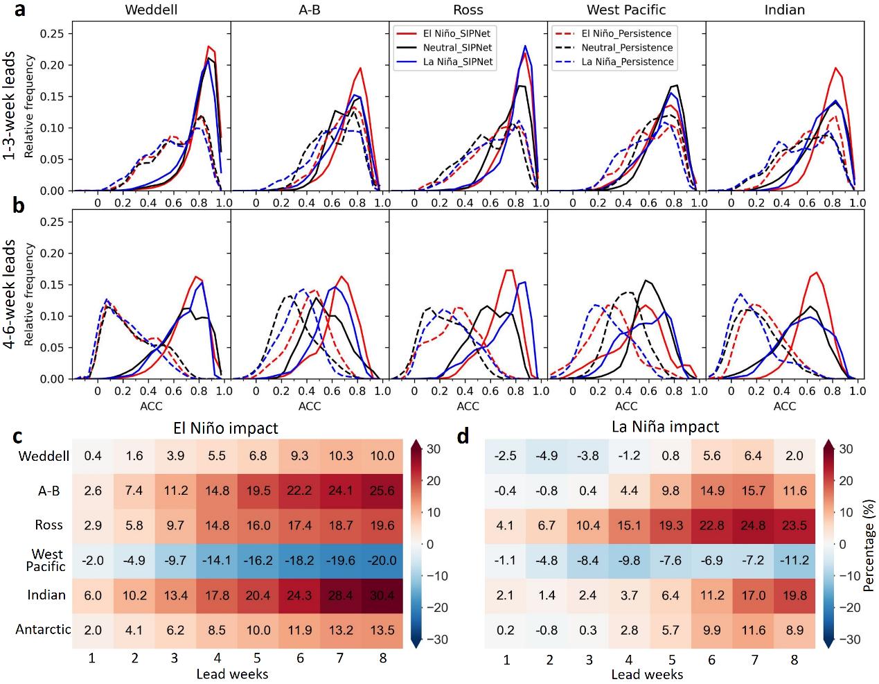 Using a deep learning model, the sea ice prediction network (SIPNet), and its linear counterpart, the research team investigated the effects of El Niño and La Niña events on Antarctic sea ice predictability. The study revealed that ENSO exerts cross-timescale influences on subseasonal predictability. Within a three-week lead time, sea ice predictability is primarily driven by the persistence of sea ice anomalies, with minimal ENSO influence. However, as the lead time extends beyond four weeks, the role of sea ice persistence diminishes, and ENSO's influence becomes increasingly dominant.