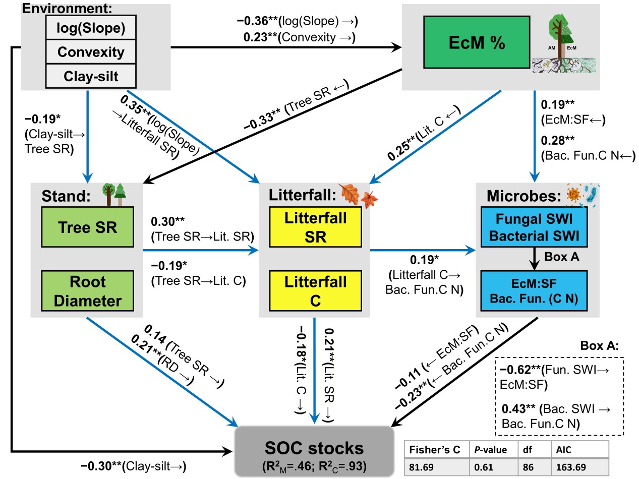 Additionally, forest areas where EcM-associated trees prevail tended to have reduced SOC, a trend that might be due to lower tree species diversity, excessive carbon-rich leaf litter accumulation, and distinctly structured soil microbial communities.