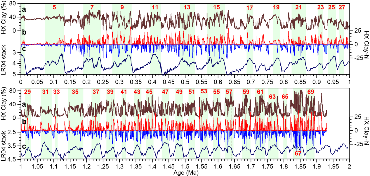 Abrupt climate changes over the last 2 Ma. (a) Clay content of HX core; (b) Strong (red) and weak (blue) monsoon events inferred from high-frequency component of HX clay content; (c) Benthic δ18O stack. (Image by SUN, et al)