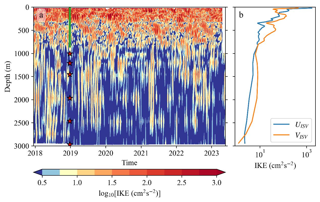 A research team led by Prof. WANG Jianing from the Institute of Oceanology of the Chinese Academy of Sciences (IOCAS), analyzed five consecutive years of mooring data collected at the equator (142°E). Their analysis uncovered significant intraseasonal kinetic energy (IKE) in the deep ocean, which is primarily concentrated in the 40–90-day period and dominated by meridional currents.