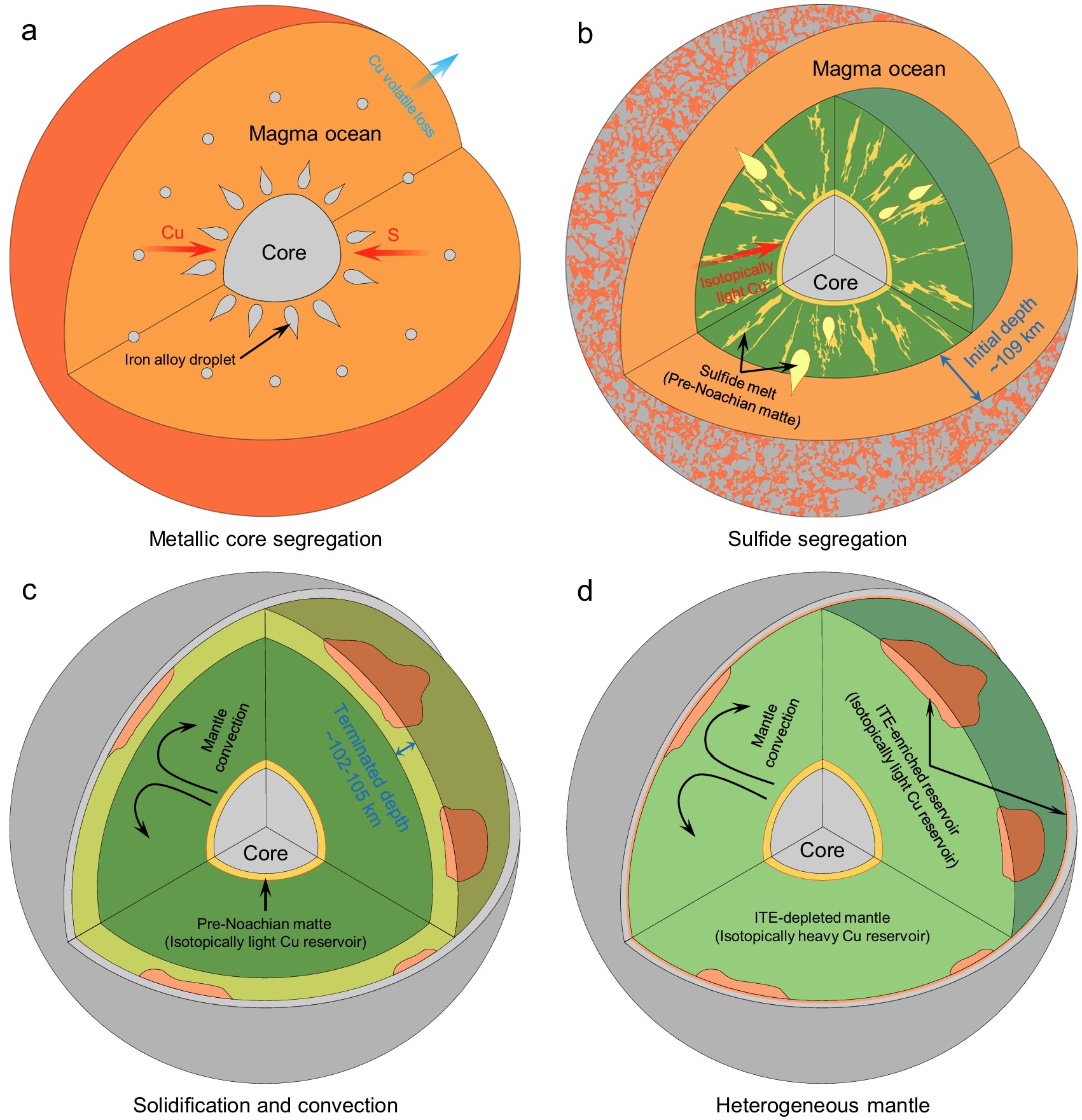 However, copper isotope constraints reveal that when the residual magma ocean shallowed to depths below approximately 102–105 km, the lower temperatures prevented sulfide melts from percolating downward. While sulfide melts formed in even shallower residual melt could still migrate downward, they failed to reach the core and instead became trapped in Martian silicate mantle. This mechanism enriched the silicate mantle with heavier copper isotopes, and the subsequent inefficient mantle convection further contributed to the formation of a heterogeneous martian mantle.