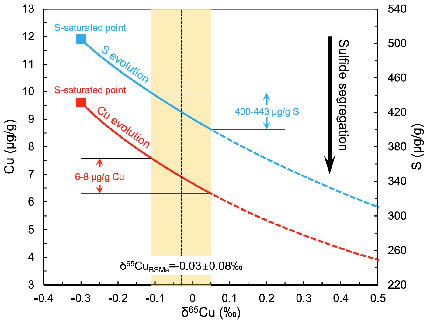 Covariation between Cu-S depletion and δ65Cu in residual melts (values converted to bulk silicate Mars averages). (Image by IGCAS)