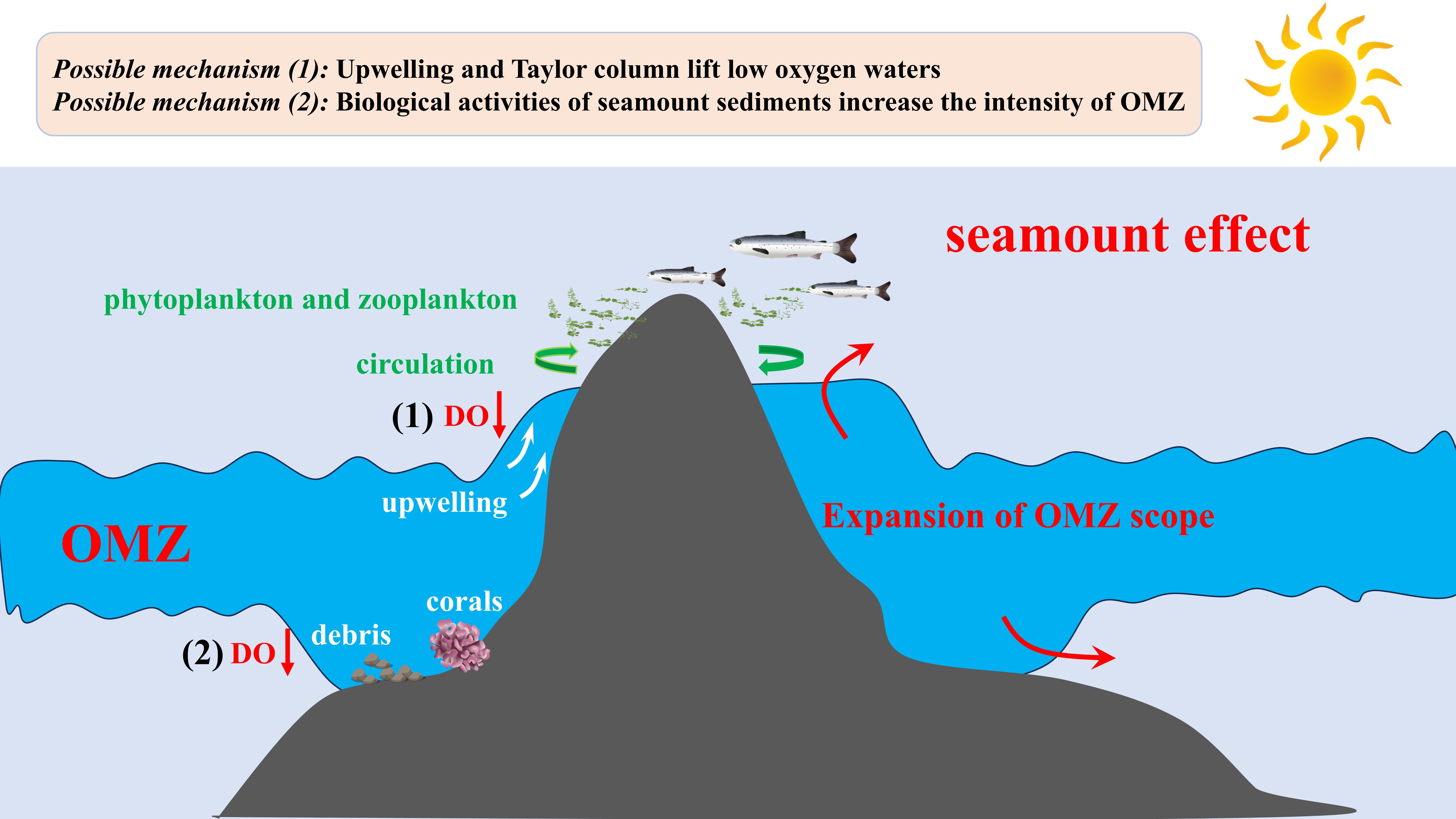 The team also proposed two possible mechanisms by which seamounts influence the OMZ. First, the hydrodynamic effect of topographic obstruction: upwelling triggered by the seamount lifts low dissolved oxygen (DO) isolines, shifting the upper boundary of the OMZ upward and expanding its vertical range. Second, the biogeochemical effect of organic matter degradation: corals, benthic organisms, and decomposition of organic matter enriched at the seamount base continuously consume DO, creating local hypoxia and thereby expanding and intensifying the lower boundary of the OMZ.