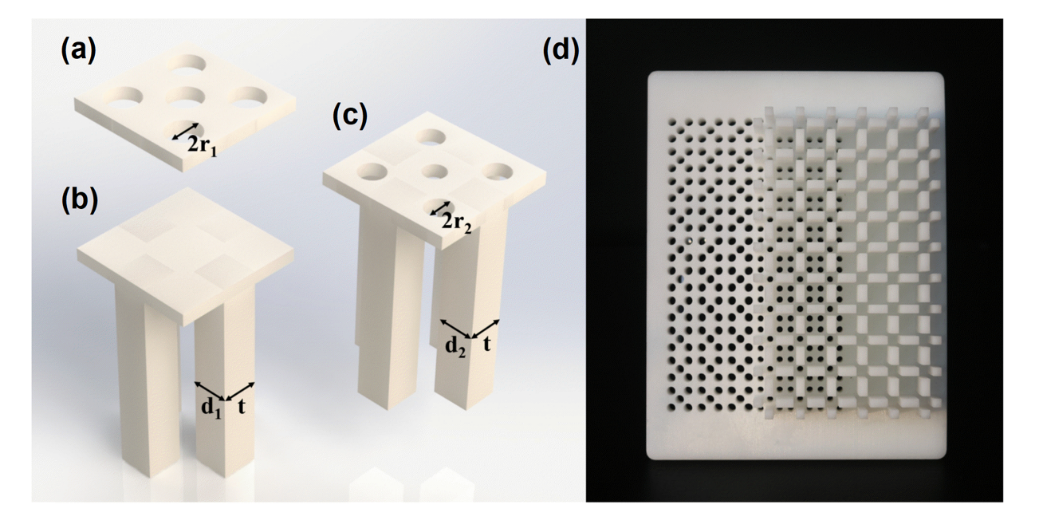 Fig. 1 Schematic illustration of basic units with (a) leaked holes, (b) inserted pillars, and (c) leaked holes and inserted pillars. (d) Photo of a sample piece (Image by IACAS)