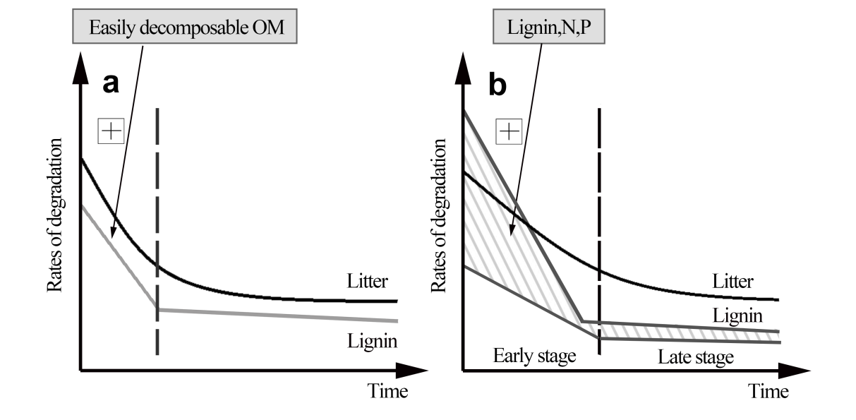 The mass loss of lignin in the early stage was significantly correlated with lignin, N and P contents, and the C/N, C/P and N/P ratios. These results improve the conceptual understanding of lignin degradation and its controlling factors.