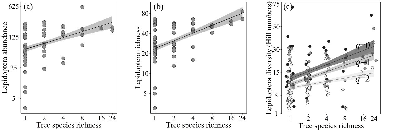 Fig. 1. Relationships between tree species richness and (a) abundance of lepidopteran larvae, (b) species richness of lepidopteran larvae, and (c) esitimation of species diversity (q = 0: estimated species richness; q = 1: Shannon diversity; q = 2: Simpson diversity). (Image by IOZ)