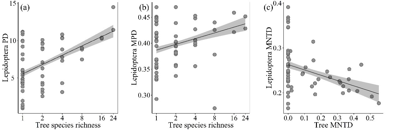 The study showed that lepidopteran phylogenetic diversity was significantly affected by plant species loss, but only when basic splits in the evolutionary history were considered. Moreover, using structural equation modeling, the results suggested that multiple components of tree diversity could synergistically affect species richness and phylogenetic diversity of lepidopteran larvae.
