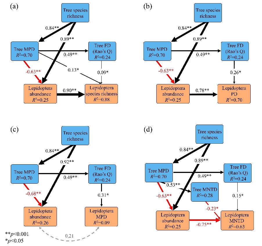 Fig. 3. Path model of trees effects of species richness, phylogenetic diversity (MPD) and functional diversity (FD) (blue color) on abundance of lepidopteran larvae and (a) species richness, and (b) Faith’s phylogenetic diversity (PD), and (c) phylogenetic mean pairwise distance (MPD), and (d) mean nearest taxon distance (MNTD) of lepidopteran larvae (orange color). (Image by IOZ)