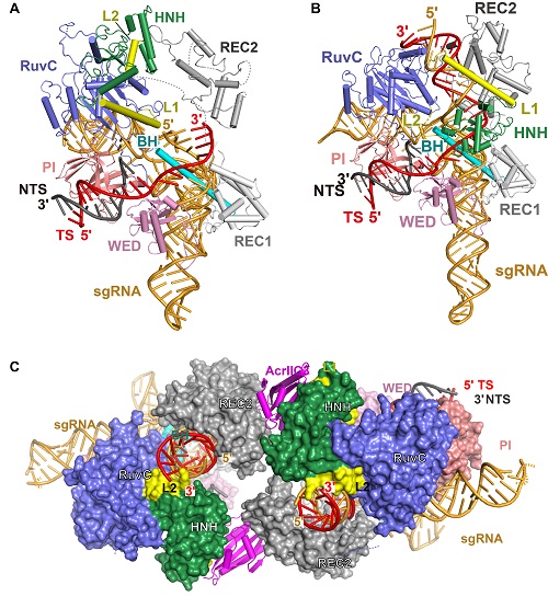 Figure: Structures of seed-matched (A), a fully paired catalytically poised (B), DNA-bound NmeCas9 complexes, and the NmeCas9-sgRNA-DNA-AcrIIC3 complex (C). (Image by Dr. WANG Yanli's group)
