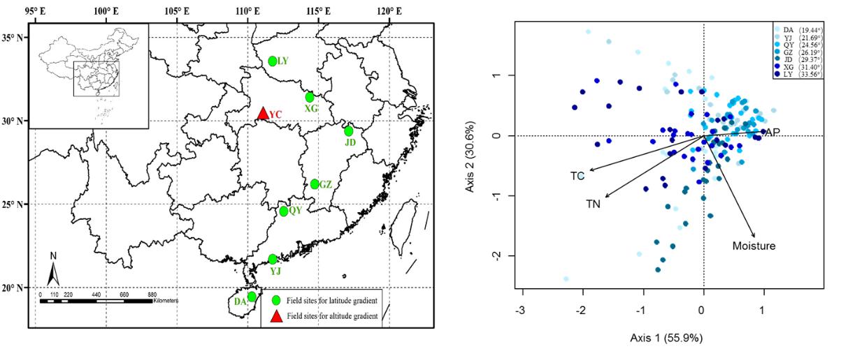 To better understand the spatial dynamics of soil nematodes, it is vital to integrate the latitudinal and altitudinal gradients. However, most studies focus on single geographical gradient, which leads to incomplete knowledge about spatial distribution patterns of soil nematodes, as well as potential mechanisms.