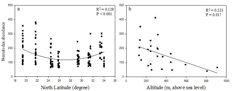 They found that the latitudinal and altitudinal patterns of soil nematodes under T. sebifera were quite different, respectively expressed as quadratic and linear trends. Moreover, soil carbon, nitrogen, moisture and annual precipitation were significant impact factors in the latitude survey, whereas no significant factor was found in the altitude study.