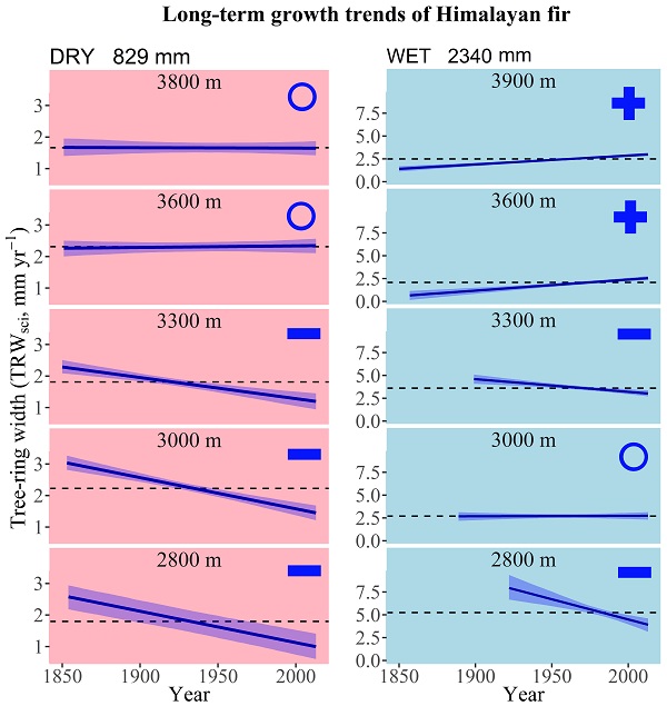 They also found that long-term negative growth trends at low to middle elevations in both dry and wet regions, although trend in tree-growth is positive at high elevations in the wet region. Warming has favored tree-growth at higher elevations in wet region, however, positive effects of CO2 rise through photosynthesis and water relations (both reducing source limitation) did not mitigate the negative effects of warming and drying on tree growth at low to middle elevations in both dry and wet regions.