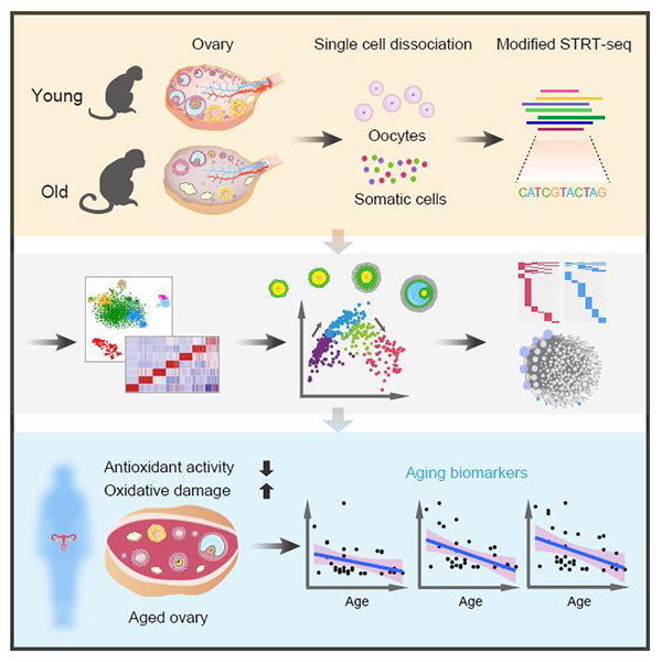 In-depth dissection of gene expression dynamics of oocytes revealed four subtypes at sequential and stepwise developmental stages. Further study uncovered that aging led to the imbalance of cell type-specific redox regulatory networks in the ovary. Antioxidant genes including GPX1 and GSR were specifically downregulated in aged early-stage oocytes, suggesting that early oocytes were susceptible to oxidative stress.