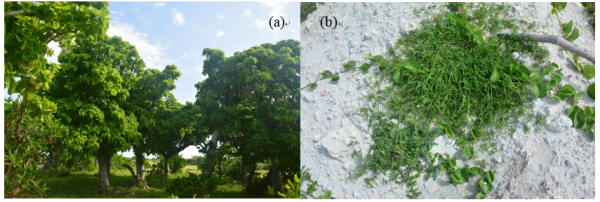 (a). Pisonia grandis in center area; (b). herbaceous community in edge area. (Image by SCBG)