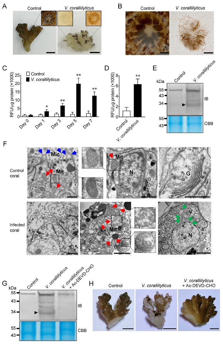 Vibrio coralliilyticus is a coral pathogen worldwide. In this study, the researchers demonstrated in a coral death model that V. coralliilyticus infection caused rapid tissue necrosis with activation of caspase 3 and GSDME, as well as subcellular structural damage including disorganization of mitochondria and Golgi apparatus.