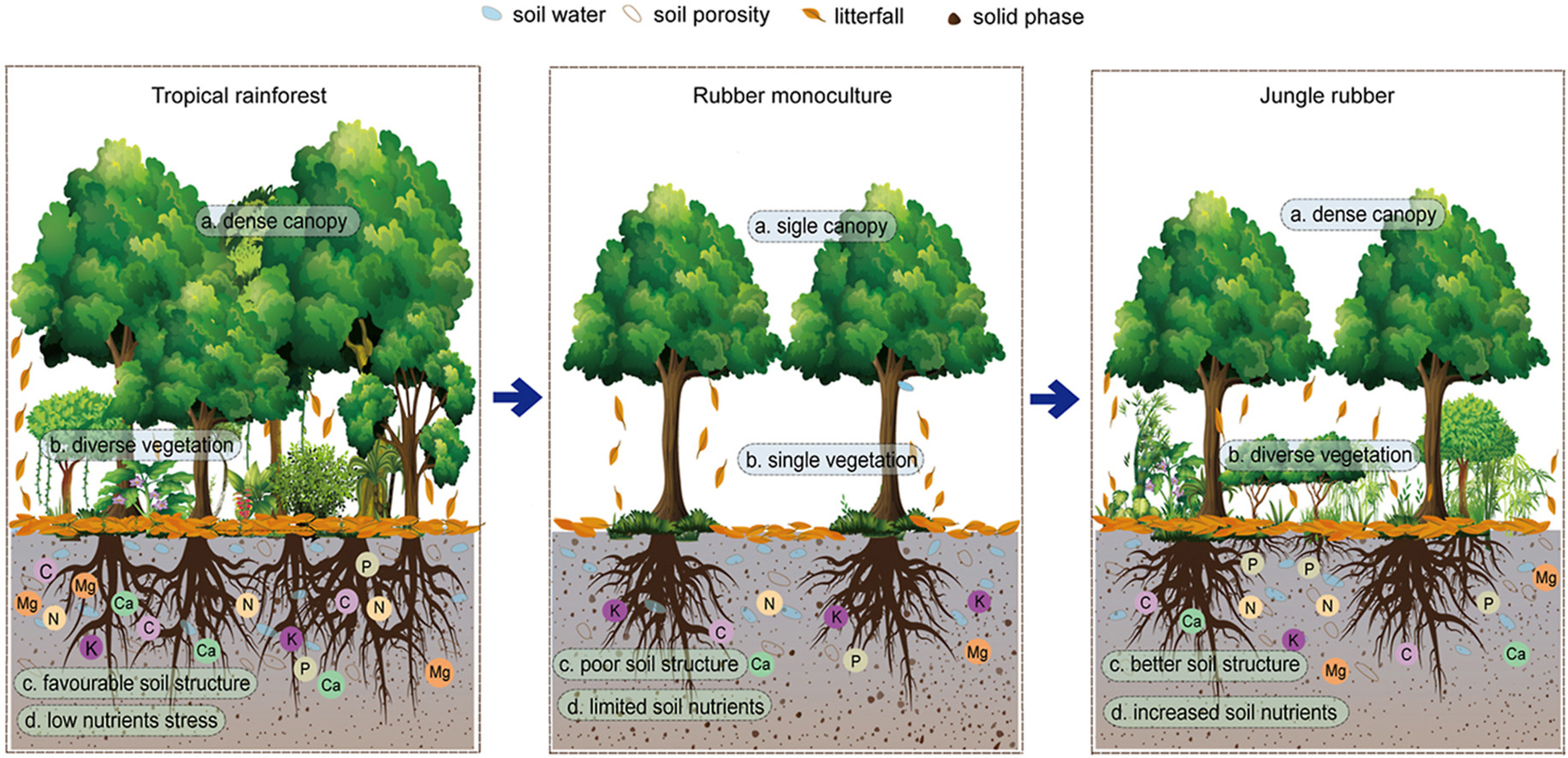 They found that soil physical properties, nutrient concentrations and nutrients relationships could be influenced significantly by land-use change. The conversion of tropical rainforest to rubber monoculture resulted in severe soil degradation, with decreased soil water capacities and soil porosities, and increases in soil bulk density, and soil acidification. The soil nutrients were also reduced in rubber monoculture compared to tropical rainforest across the vertical soil profile.