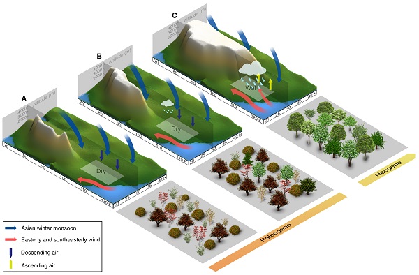 Simplified Tibet growth stages, climate, and vegetation changes from the 55 million years ago (A) to 40 million years ago (B) where uplands in southern Tibet grow as Indian started to collide with Asia. The strong Asian winter monsoon pushed further South into East Asia causing drier climate with poorer plant and animal diversity. As northern Tibet grows (C), the Asian winter monsoon is progressively blocked allowing moisture-rich southeasterly winds to influence East Asia. This results in a warmer and wetter climate supporting more of plant and animal life in the region. (Image by LI Shufeng)