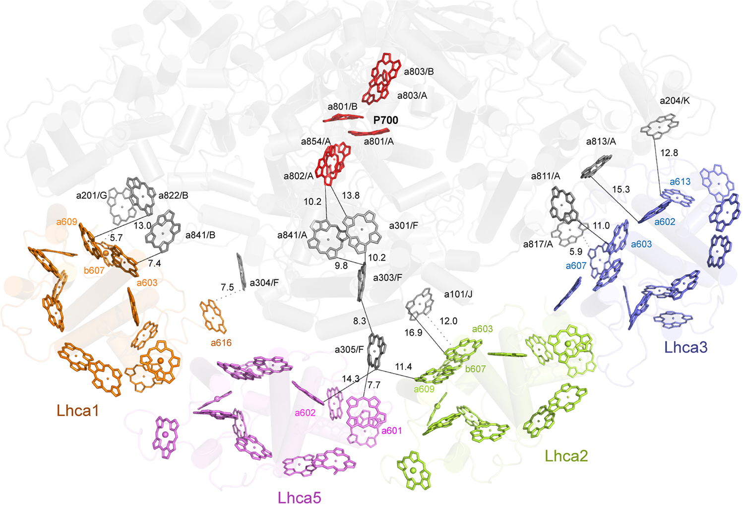 Fig. 2. Plausible energy transfer pathways from LHCI to the PSI core of P. patens. (Image by IBCAS)