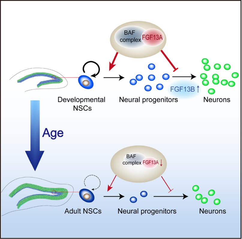 In this study, the researchers found that expression of isoform A of FGF13 was decreased in NSCs with age-related decline of DG neurogenesis, and deficiency of FGF13 in NSCs caused remarkable impairment of postnatal neurogenesis in the DG, and hippocampus-related learning and memory behaviors of mice.