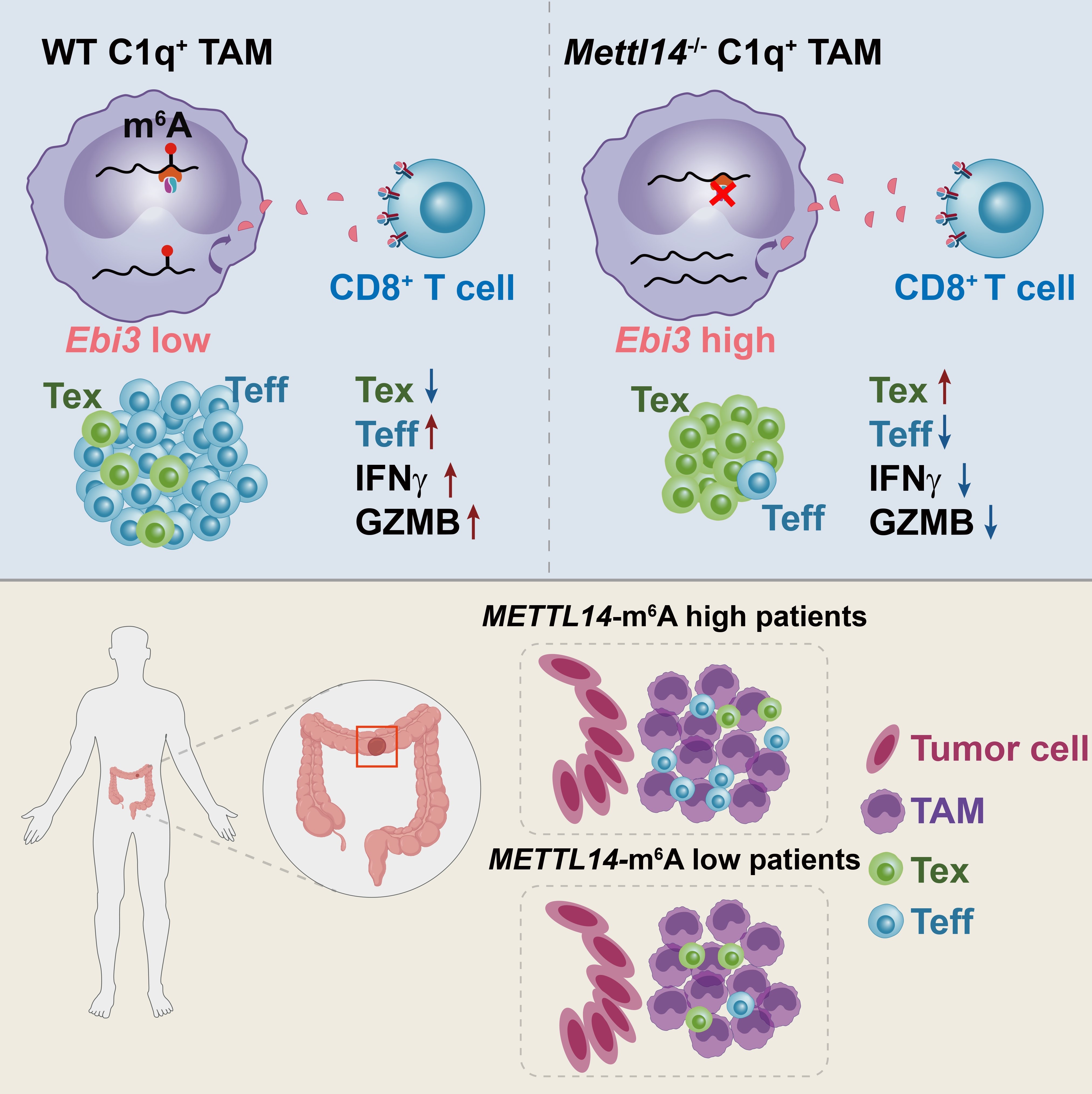 This study revealed a new mechanism that Mettl14 deficiency in macrophages can promote the accumulation of Ebi3, thereby driving CD8+ T cell dysfunction. It also showed that the function of macrophages was regulated by m6A modification at the epitranscriptomic level and emphasized that the functional plasticity of macrophages could be precisely switched through the dynamic epitranscriptome. Blocking the downstream molecules of Mettl14, such as EBI3, should be hopeful to restrict T cell dysfunction and improve the responsiveness of immune checkpoint blockade.
