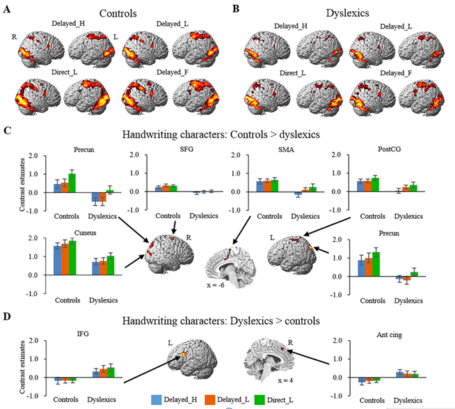 Compared to controls, dyslexic children exhibited reduced activation during handwriting tasks in brain regions supporting sensory-motor processing (including supplementary motor area and postcentral gyrus) and visual-orthography processing (including bilateral precuneus and right cuneus). Among these regions, the left supplementary motor area and the right precuneus also showed a trend of reduced activation during reading tasks in dyslexics.