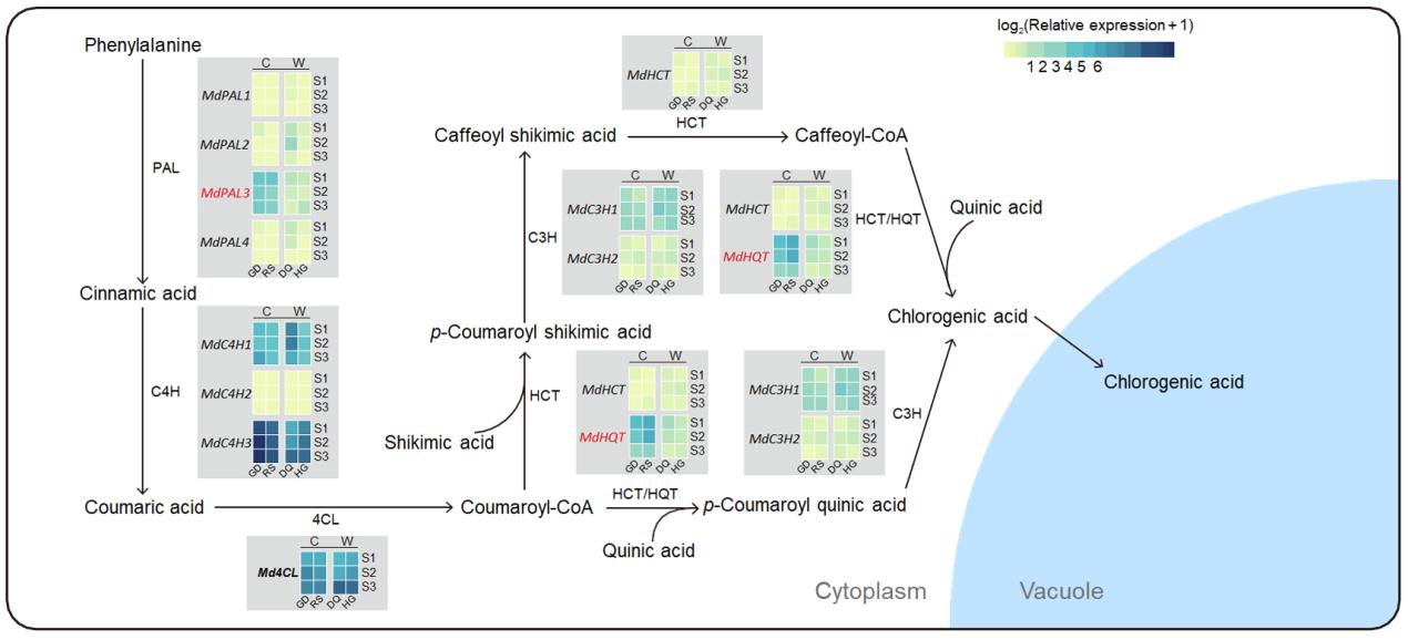 Additionally, the researchers revealed that the transcriptional levels of two structural genes, MdPAL3 and MdHQT, were significantly correlated with CGA contents, suggesting their crucial roles in determining CGA accumulation in apple fruits.