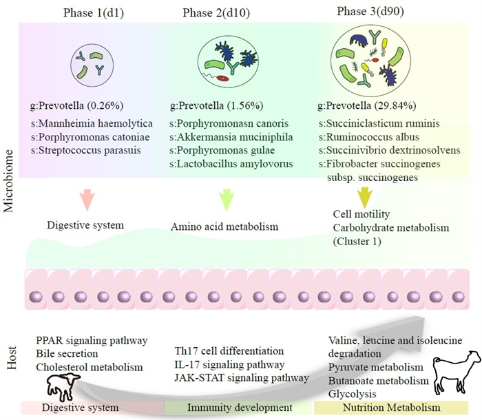 These findings redefine ruminant gastrointestinal maturation as a bidirectional developmental cascade in which early microbial succession not only programs host immunity, but is reciprocally shaped by epithelial transcriptomic adaptations-a paradigm shift for optimizing livestock productivity through targeted microbiome stewardship during critical windows.