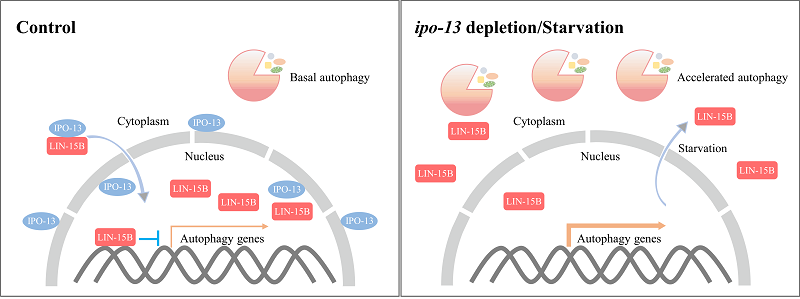 Model showing that IPO-13-mediated cytoplasm-to-nucleus transport of LIN-15B controls autophagy activity. (Image by ZHANG Hong's group)
