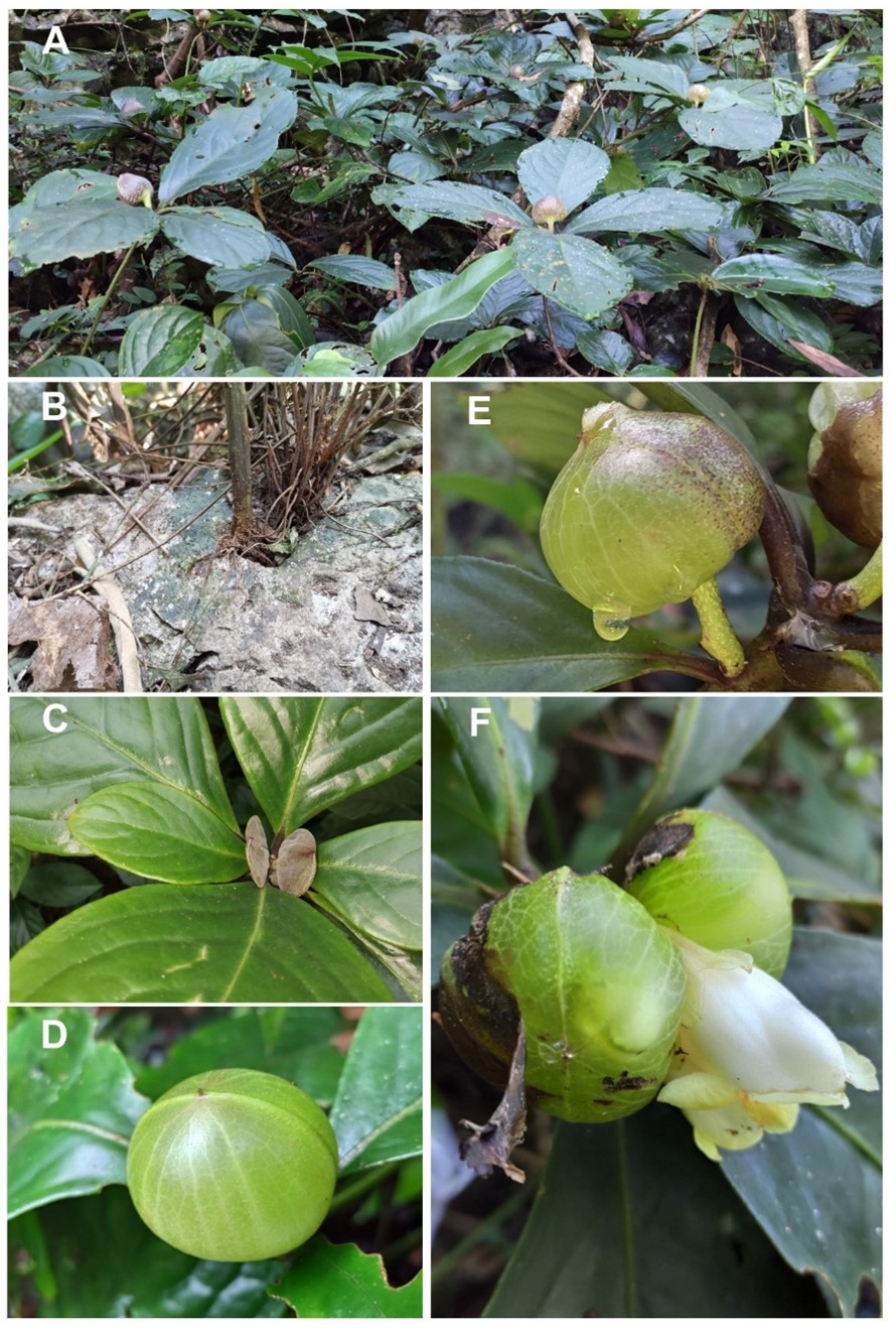 Habitat (A, B) and floral bracts (C-F) of Hemiboea magnibracteata. (Image by KIB)