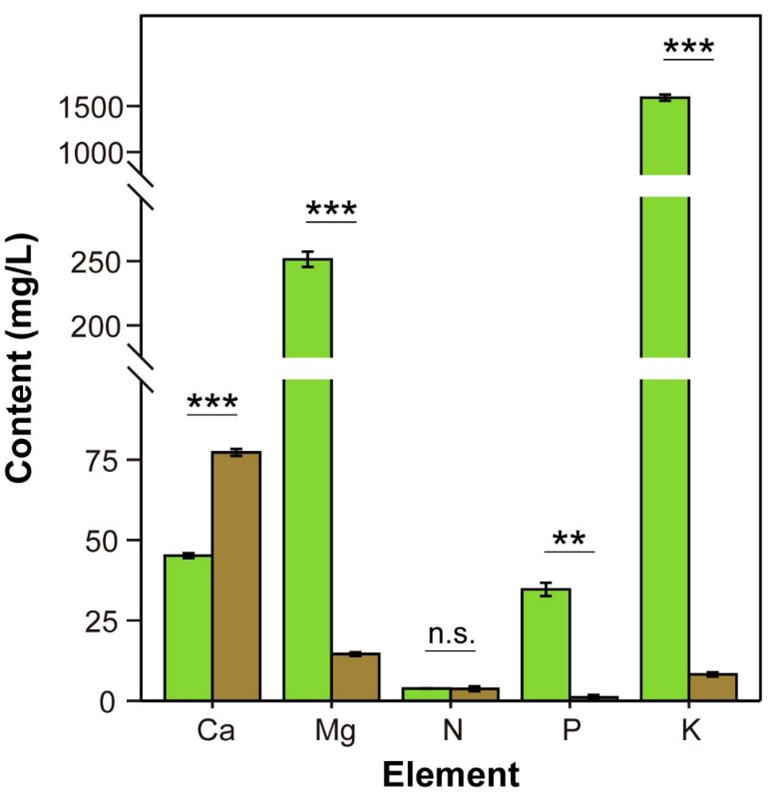 Contents (mean ± SE) of various elements in the fluid from leaves (green) and bracts (brown) of Hemiboea magnibracteata. *** and ** indicate significant difference at P < 0.001 and 0.01, respectively. (Image by KIB)
