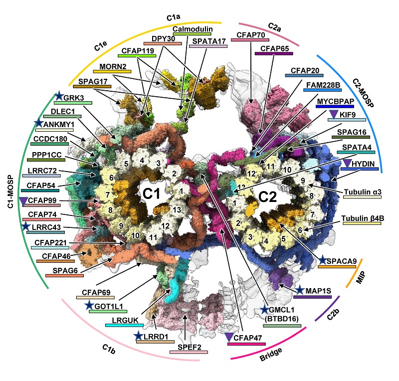 The study provides a detailed view of the assembly mode of the C1-C2 microtubules and their associated inner and outer binding proteins. The researchers constructed a structural model comprising 466 protein subunits and identified 39 distinct component proteins, including eight newly discovered CA proteins: GRK3, ANKMY1, LRRC43, GOT1L1, LRRD1, MAP1S, GMCL1 (BTBD16), and SPACA9.