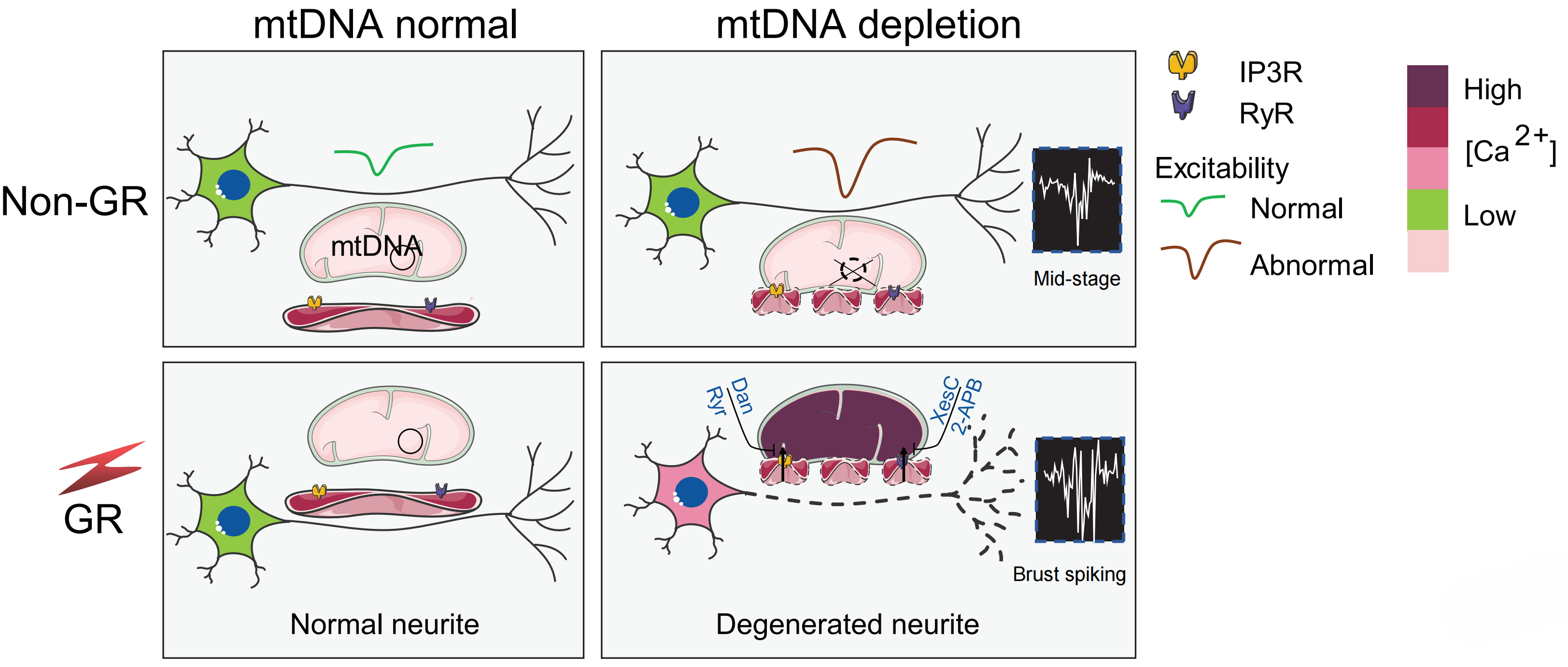 Caloric restriction induces neurodegeneration in mtDNA-depleted neurons by altering ER-mitochondria calcium transfer. (Image by Prof. LIU's team)