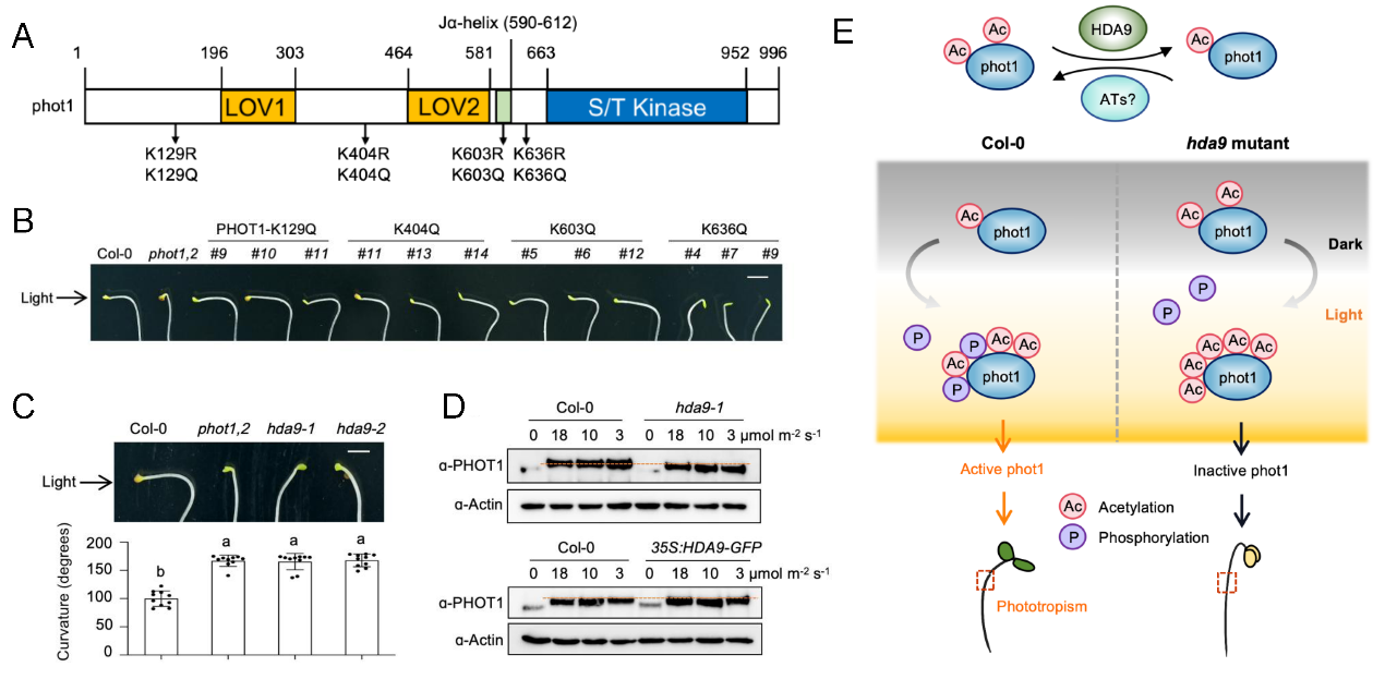 Genetic phenotype screening pinpointed the lysine deacetylase HDA9 as a key player: it regulates phototropism by adjusting phot1's acetylation levels, thereby altering its phosphorylation status and kinase activity. Notably, this "acetylation-phosphorylation cross-regulation" was found to be highly conserved across species including tomato, tobacco, and peanut, underscoring its broad significance in plant phototropic signaling.