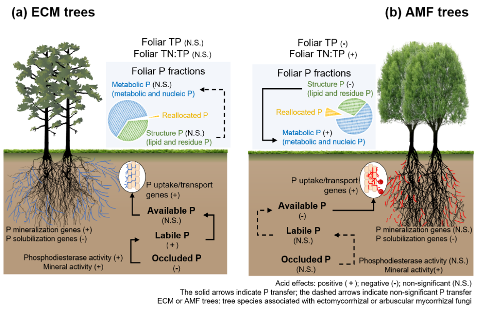 In contrast, AMF trees experienced significant drops in both rhizosphere phosphorus availability and foliar phosphorus content. However, they showed more efficient foliar phosphorus reallocation — reducing structural phosphorus while increasing phosphorus in metabolic pools.