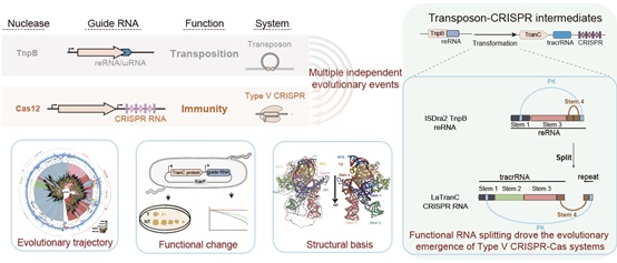Cell, show that the functional splitting of transposon-derived RNAs was the critical innovation driving the emergence of Type V CRISPR-Cas immunity.