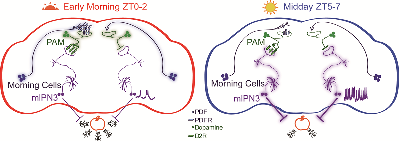 This fluctuation is driven by a group of circadian neurons, morning cells, which activate dopaminergic neurons PAM-β'2 via pigment-dispersing factor (PDF) neuropeptide in the early morning, thereby inhibiting mlPN3 neurons.