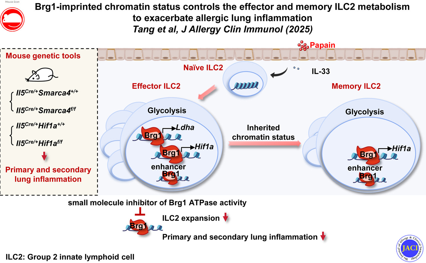 Researchers have revealed a novel mechanism by which the chromatin remodeler brahma-related gene 1 (Brg1) regulate Group 2 innate lymphoid cells (ILC2s) in allergic lung inflammation. Brg1 exacerbates allergic lung inflammation by regulating the chromatin status of ILC2s, enhancing their aerobic glycolytic metabolism, and consequently promoting the expansion of effector ILC2s (ILC2eff) and memory ILC2s (ILC2mem).