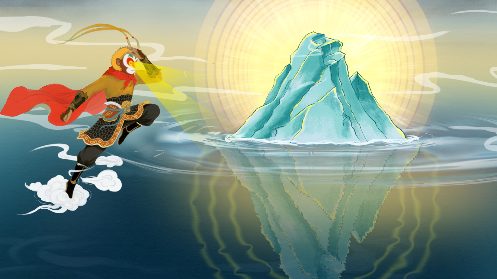 This figure uses SUN Wukong's (the Monkey King) iconic "Fiery Eyes of Truth" as a metaphor for rhythmic attentional sampling, illustrating how visual awareness modulates the process. SUN Wukong's Fiery Eyes (representing attentional sampling) emit focused, beam-like signals toward an iceberg—half exposed above the sea (conscious state) and half submerged below (unconscious state). Beams targeting the exposed (conscious) segment produce faster, brighter halos, matching the accelerated sampling optimized by visual awareness. In contrast, beams aimed at the submerged (unconscious) segment create slower, dimmer halos, reflecting baseline sampling that persists without awareness. (Image by Drs. JIANG Yi and YANG Fang)