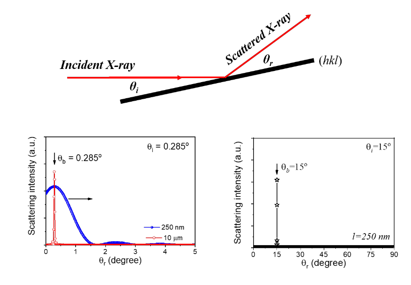 Scatterings of two crystal planes, which intersection angles with incident X-ray are 0.285o and 15o, respectively. The lateral size of the crystal plane in (a) was assumed to be 250 nm or 10 μm, while the lateral size of the crystal plane in (b) was only assumed to be 250 nm. (Image by LI Xiangyang)