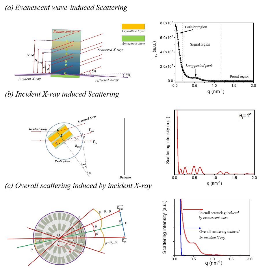 Results indicated that the scattering induced directly by incident X-ray was not the origin of SAXS signal. As shown in Figure 2b, it formed double-peaks, which were never observed in real scattering. It was very weak due to the following two reasons. First, a scattering of a lamellar stack was weak, since its intensity was proportional to the square of relative density difference of amorphous and crystalline layers. Second, destructive interference between lamellar stacked. The scattering induced by evanescent wave was the genuine origin, because of strong form factor and structure factor and avoiding destructive interference. It could form similar scattering pattern as seen in real SAXS: Guinier scattering in small q range, long period peak in the intermediate q range and Porod scattering in high q range (see Figure 2a).