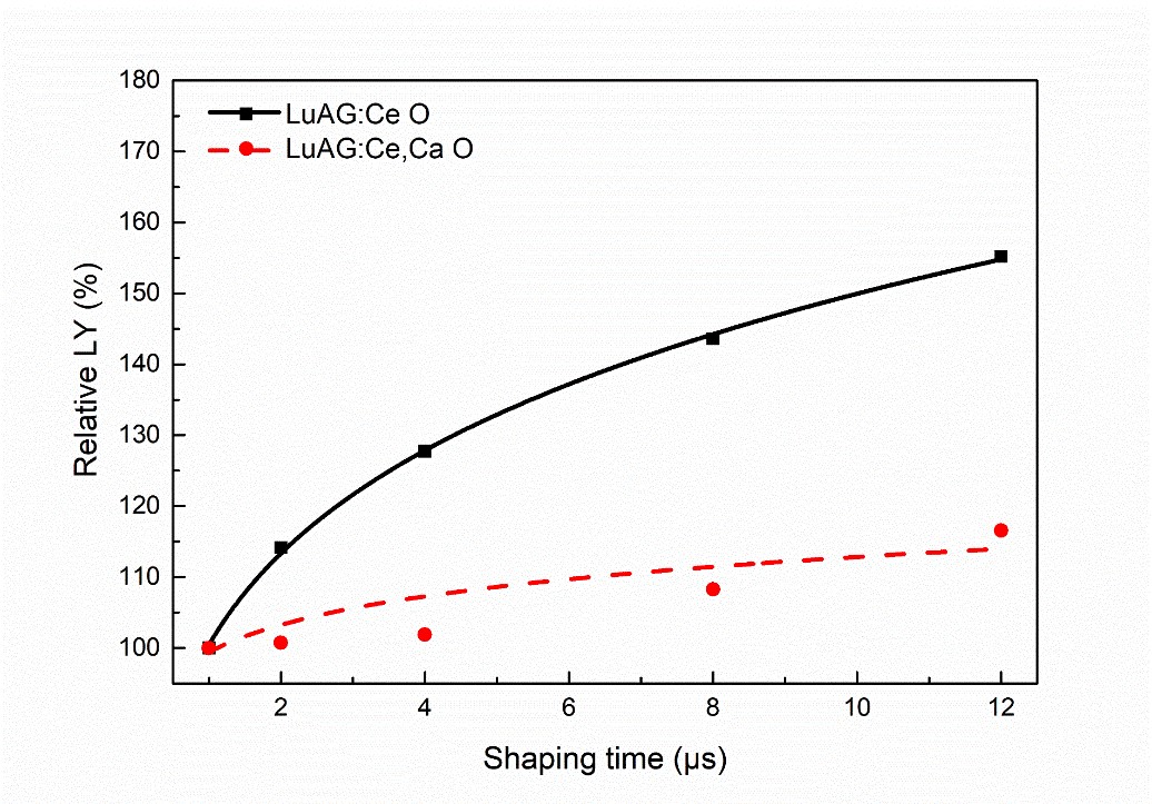 Relative light yield of the annealed LuAG:Ce and LuAG:Ce,Ca ceramics at different shaping time from 1 μs to 12 μs. (Image by SIOM)