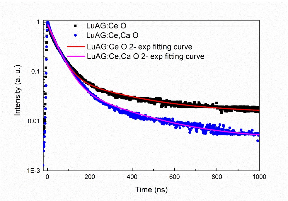Decay curves of oxygen-annealed LuAG:Ce and LuAG:Ce,Ca ceramics (Image by SIOM)