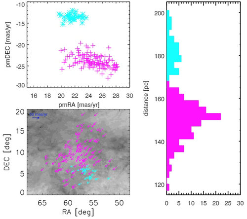 Location, proper motion and distance distribution of the two new stellar associations (cyan and magenta) (Image by NAOC)